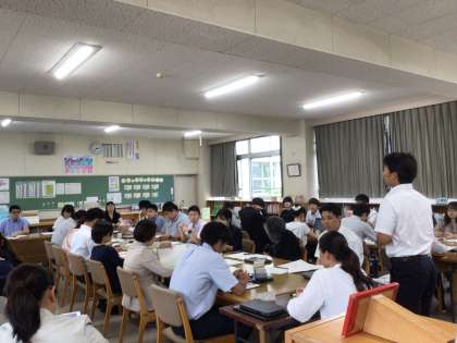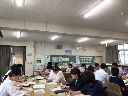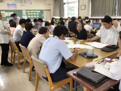 参観した授業をもとに、効果的な支援、授業における支援について話し合います。それぞれ教科は違っても他教科にも生かせる支援があります。研究協議題について話し合います。
