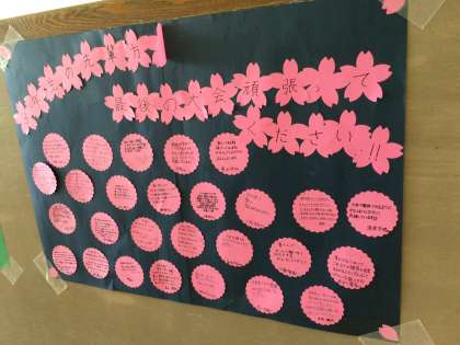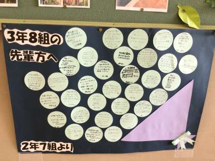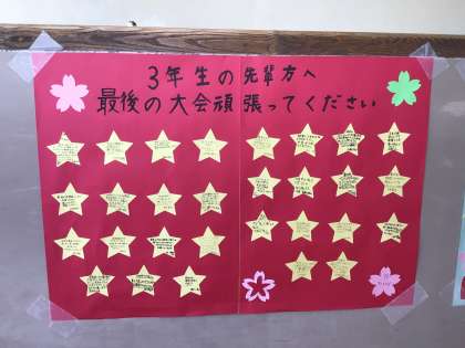 3年生廊下には、最後の大会に臨む3年生に向けて、2年生からの激励メッセージが掲示してあります。すでに大会を終えた部もありますが、今週末や来週末に大会が控えている部、決勝トーナメントに進んだ部、西三大会出場を決めた部もあります。後輩からのメッセージは励みになりますね。