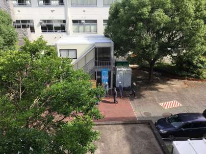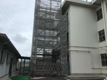 北校舎トイレの改修工事が進んでいます。足場が組まれ、安全に作業するための囲いが立てられています。順調に工事が進んでいます。作業してくださる皆様、暑い中ありがとうございます。