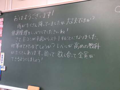 写真は3年生の教室です。8時5分。生徒は落ち着いた雰囲気で朝の活動を始めていました。黒板には担任の先生からのメッセージが書かれていました。