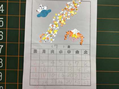 月初めになると1、2、3学級の子がカレンダーを届けてくれます。6月は折り紙で作ったカエルが貼られたカレンダーでした。7月は小さな手作りの星がたくさん貼ってある七夕のデザインのカレンダーです。細かい星をのりで貼るのに根気がいったと思います。天の川の両側には織姫と彦星があしらわれています。かわいいです。