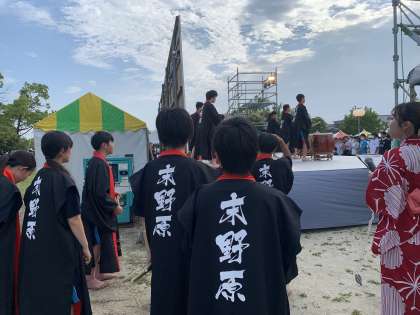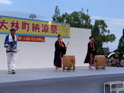 納涼祭のご盛況おめでとうございます。いろいろな世代が集うこうした催しはいいですね。第二部の盆踊りでも、太鼓部の生徒がステージ上で太鼓を叩き、納涼祭を盛り上げました。