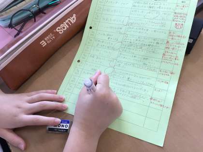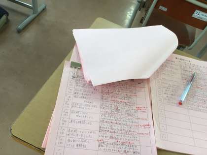 毎回、生徒が振り返りのシートに記入し、先生は一人ひとりに赤ペンでコメントを書いています。全校730人の生徒の音楽を2人の先生で担当していますので、赤ペンを入れる枚数もなかなかのものです。自分が生徒だったらきっと嬉しいですよね。先生のひとことは楽しみでもあり、励みにもなりますね。