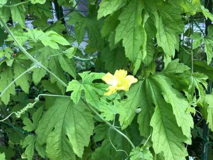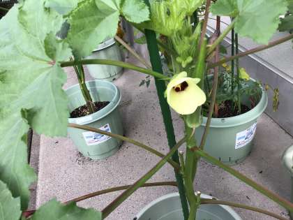 正解は、2枚目はゴーヤ、3枚目はオクラです。ゴーヤの花は実の苦みからは想像できないぐらい甘くて濃厚な香りがします。南国を思わせるジャスミンのような香りです。葉っぱはゴーヤの匂いがします。見かけたら匂いをかいでみてください。