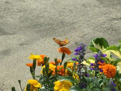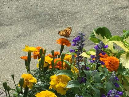 公務手さんたちが丹精を込めて育て、手入れをしてくれている玄関のプランターに蝶が飛んで来ました。綺麗な花に誘われたようです。