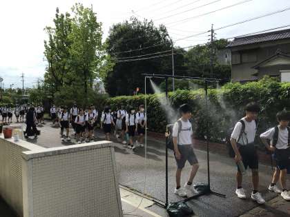 部活動を終えた生徒は汗びっしょり。気持ちよさそうにミストを浴びて教室に向かいます。7時50分。