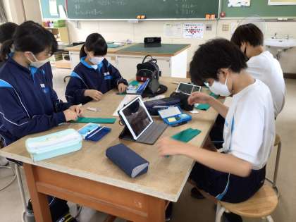 1年6組の家庭科の様子です。生徒がフェルトを使って玉どめ、なみ縫い、玉結びの練習をしていました。目の前に置いてあるタブレットで参考動画を見ることができます。