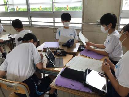 今日の授業では「魅力的な提案をしよう・資料を示してプレゼンテーションをする」という内容で、テーマに沿った資料作成や原稿作成を行っていました。調べたり、プレゼン資料を作成したり、原稿を読んでタブレットのストップウォッチで時間を測ったりと、ここでもタブレットが様々活躍していました。国語の授業でもタブレットを用いてプレゼン資料を作る時代になりました。