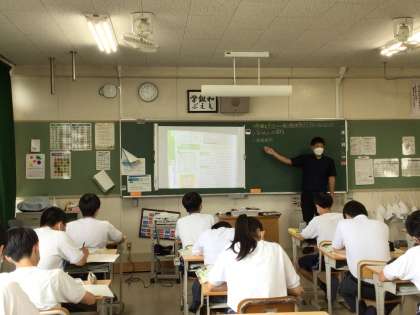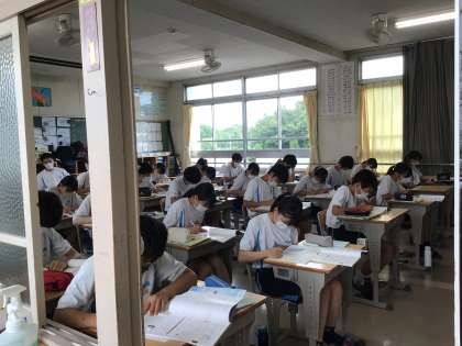2枚目の写真は3年7組、数学です。復習プリントに取り組んでいました。3枚目の写真は3年3組です。3年生は今、公民を勉強しています。