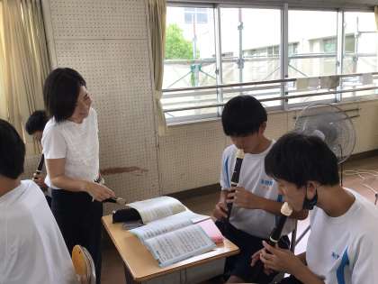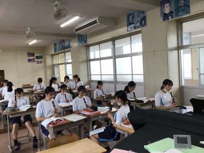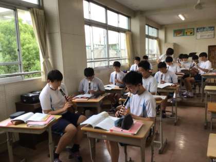 写真は3年8組の音楽の授業です。リコーダーの練習です。曲は「空も飛べるはず」。シのフラットが出てきます。ちょっと難しいですが頑張りましょう。