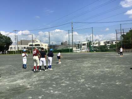 2枚目の写真は運動場で練習をする野球部です。クラブチームで活動する生徒が多く、学校の野球部は人数が少ないです。顧問の先生と楽しく練習をしていました。大会には合同チームで出場しています。