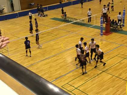 男子バレーの試合が始まりました。その前の試合も熱戦だったので、時間より随分遅れて試合が始まりました。まだ第1セットです。よく声を出して元気いっぱいコートを駆け回っています。1セット目から接戦です。白いユニフォームが末野原です。がんばれ!