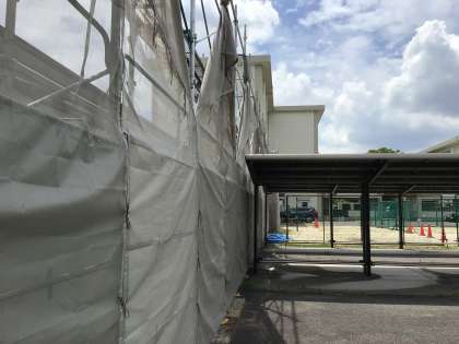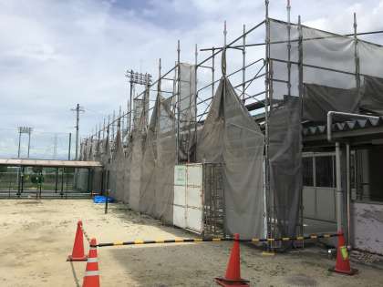 夏休みの授業のない時期を中心に金工室や木工室の外壁塗装工事が行われています。今年度は北校舎のトイレが新しくなり、武道場の外壁も綺麗になります。暑い中連日工事をしてくださっている方たちには頭が下がります。ありがとうございます。