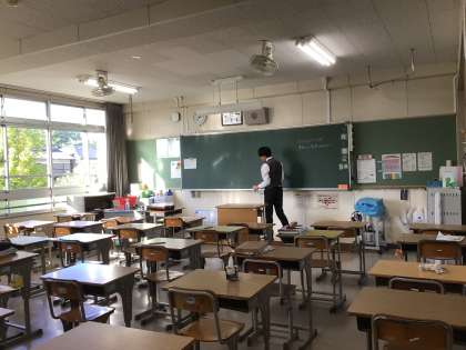 おはようございます。長い夏休みが終わりました。朝7時過ぎの校内の様子です。黒板に向かう先生、窓があいた廊下や教室。電気が灯り、エアコンも稼働して生徒の登校を迎えます。爽やかな朝です。