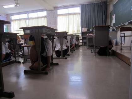 今回は、地震を想定して、机の下に隠れ、頭を守りながら避難経路を確認しました。