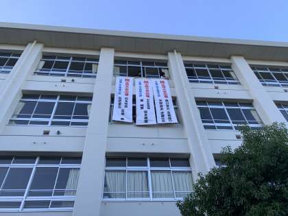 今日の夕方に校舎に新しい垂れ幕を飾りました。弓道部の皆さんの全国大会出場を祝って作った垂れ幕です。祝、全国大会出場。頑張ってくださいね!