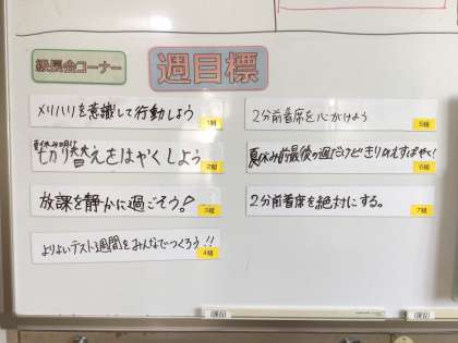 3枚目の写真は2年生級長が各学級の目標を立てたものです。2年2組の前に置いてある学年の連絡掲示板(ホワイトボード)に目標や連絡、学年主任からのメッセージなどが書かれています。