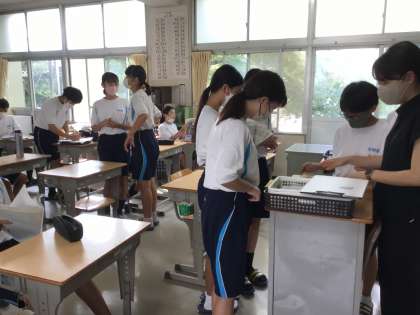 登校してきた生徒は、カバンから学習用具を出し、荷物をロッカーに収め、テキストやプリント、末中っ子(連絡帳と日記)を提出します。上の2枚の写真は1年生です。担任の先生が「いつも整頓や点検を手伝ってくれます。いい子たちです!」と目を細めていました。