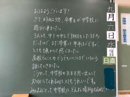 下の写真は2年生クラスの黒板日記です。担任した卒業生が先生を訪ねてくれたそうです。卒業生の成長は嬉しいものです。目の前の生徒たちも、これからどんどん成長して、いつか母校を訪ねてくれることでしょう。