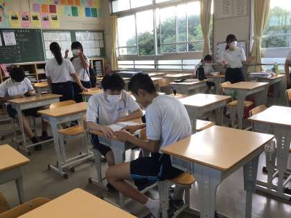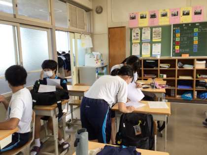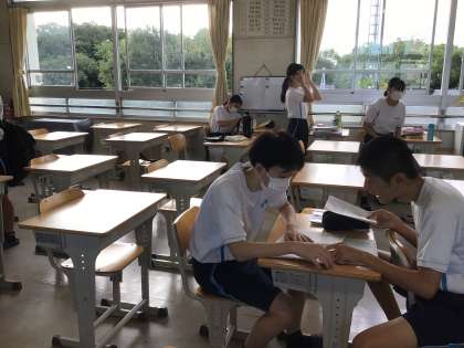 7時50分。3年生教室で、生徒がテスト勉強中でした。家でテスト勉強をした時に分からなかったところを友達に聞いているようです。さすが3年生です。こうして学校での時間を有効に使うのはとても良いことです。