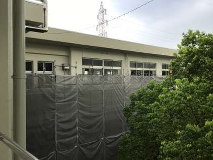 おはようございます。昨日から断続的に雨が降り続いていますね。まだ雨は降りそうです。今日は前期期末テスト2日目です。そろそろ眠い目をこすりながら生徒が登校してくる時間です。北校舎トイレのリニューアル工事が着々と進んでいます。幕に覆われた足場の中で、工事の方が早朝から作業をしてくださっています。暑い時期も黙々と毎日作業してくださる姿に頭が下がります。