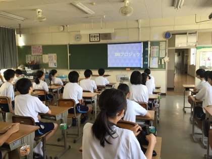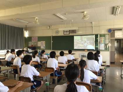 下の写真は、その映像を見ている2年7組の生徒たちです。後輩の取組の様子をしっかりと見ていました。タブレットが導入されたことによって、活動を記録するにも、共有するにも、とても便利になりました。