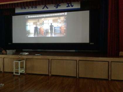 舞台上のスクリーンに映し出されているのは、ダンスが得意な先生(3年生の担任の先生)が踊っている映像です。キレキレのかっこいいダンスです。生徒はそれを見ながら一生懸命に練習していました。また、その動画は生徒のタブレットでも見られるようになっているので、家で練習することもできます。頑張って練習してくださいね!完成が楽しみです。