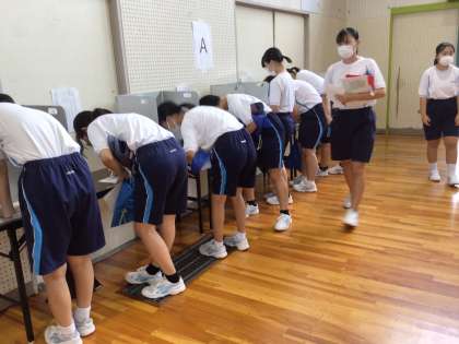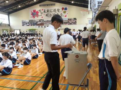 投票の様子です。コロナ禍で対面の立会演説会が開催できず、タブレットの中継による立会演説会を行う時期が続きました。3学年が全て揃って体育館で行う立会演説会は久しぶりのことです。壇上で話す生徒も、話を聞いている生徒も、どちらも大変立派でした。