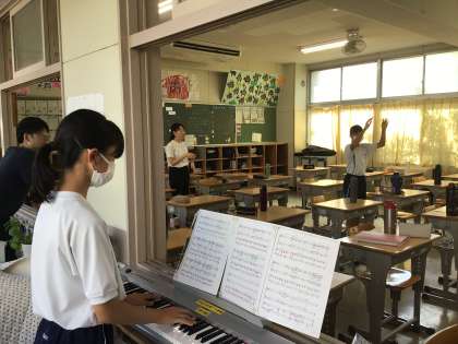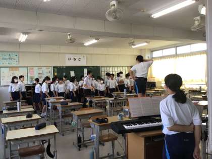 下の写真は1年5組です。ちょうど歌っている様子を写真に撮ることができませんでしたが、いつも先生も一緒になって良い雰囲気で練習が進んでいます。
