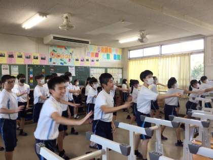 校長室のほぼ真上から元気な声が響いてきました。またまた急いでタブレットを手に階段を駆け上がっていきました。声の主は3年3組です。曲に合わせてダンスを踊っていました。「ハイハイハイハイ!」気合が入っています。