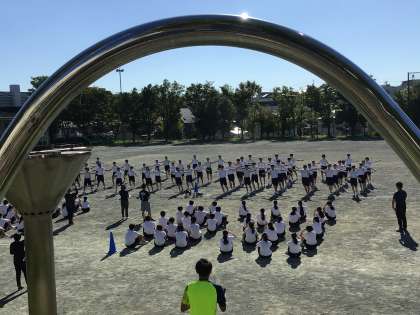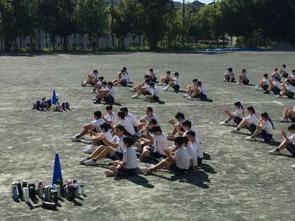 3年生が運動場に移動しました。体育祭当日の並び方を決めるために本番モードで踊ります。ドキドキ。2クラスずつ踊るのをお互いに見合います。踊り終わったクラスに、他のクラスの生徒たちから拍手が沸き起こっていました。