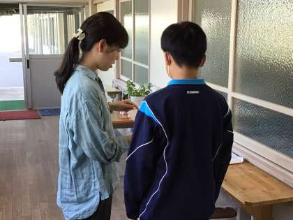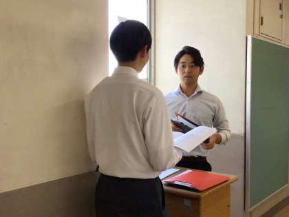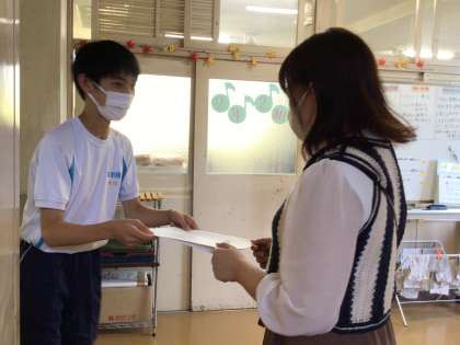 担任の先生は、一人一人の生徒に、前期に頑張っていたところや、後期に向けて頑張りどころのアドバイスをして、通知表を手渡していました。