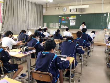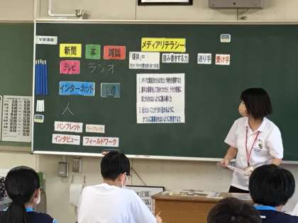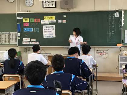 2年生の国語の授業です。今日は図書館司書さんによる授業です。世の中に溢れる様々な情報。それらの情報をどう受け取ったり発信したりすれば良いか。