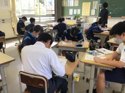 資料は、有名なアルピニストの野口健さんの経験を綴ったもので、自分の愛する山(エベレストや富士山)がゴミで汚れている有様を見て、自らゴミを片付ける行動を起こしました。こうした行動に込められた野口さんの思いに触れ、生徒は自分自身が日常生活でどう行動していくかを考えていました。