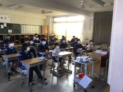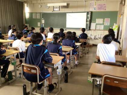 朝の活動の時間に、各クラスの体育祭への意気込み動画を見ました。