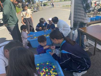 クッキーを売るテント、ポン菓子を作っているテント、風船釣りのテントなど、いろいろなところで活躍する生徒の姿がありました。スーパーボールすくいや風船釣りのコーナーでは、小さい子に優しく声をかける姿がありました。