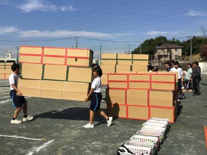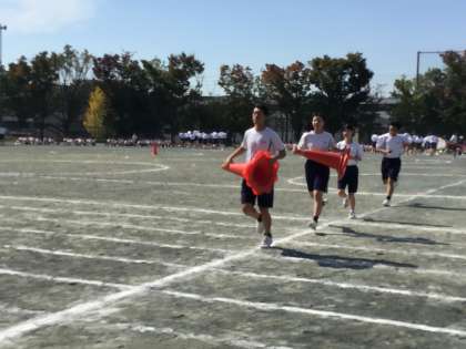 今日の予行練習では体育祭の裏方を支える各係の動きの確認も行っています。先生の指示を聞いて素早く動く係の生徒たち。真剣な表情です。
