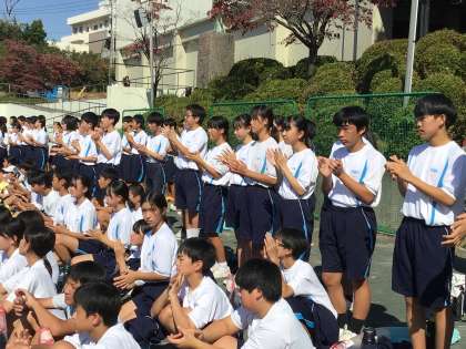 3年生の演技を見つめる先生たちと1年生。1年生は先輩の演技に何を感じたでしょうか。真剣な眼差しでじっと演技を見ていました。