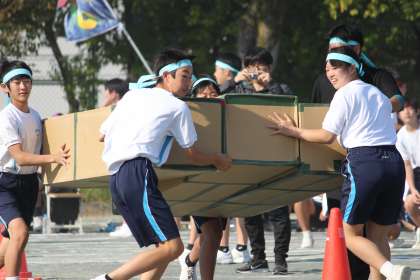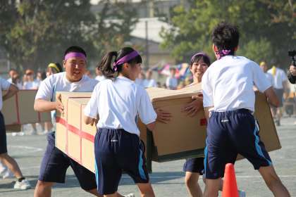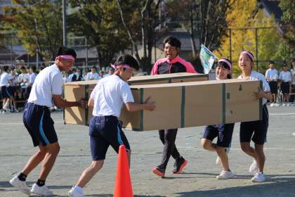 各学年で工夫を凝らした学年種目も行いました。写真は3年生の学年種目です。大きなダンボールの箱をチームで運びます。なかなか難しい!