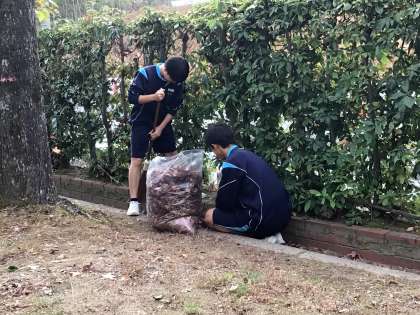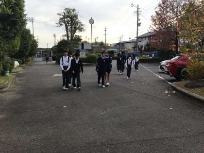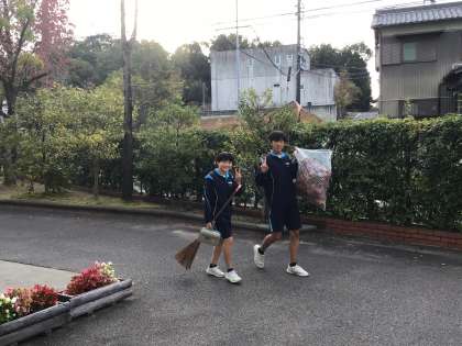 おはようございます。学校にはたくさんの樹木が植えられています。3週間ほど前から、色づいたカエデの葉が盛んに落ちてくるようになりました。教室の窓から真っ赤に紅葉した木が見えるのはとても綺麗なのですが、集めても集めても翌朝には葉っぱがたくさん落ちています。毎日ボランティアで掃き掃除をしてくれている人たちがいます。毎朝の爽やかな光景です。ありがとう!