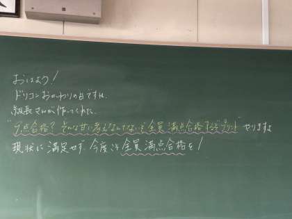 これは生徒が登校する前の写真です。2年生の教室の黒板メッセージには、学年で取り組んでいるドリルコンテストのことが書かれていました。テストに向けてみんなで頑張っていくために、級長がプリントを作ってくれたそうです。わからないところを休み時間などに友達に教えてもらったりするのもいいですね。家で自分で取り組む学習、疑問を解決する学習。両方の時間をうまく使えるといいですね。