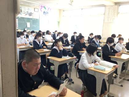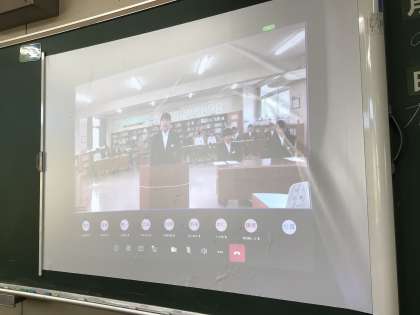 オンラインで行っている生徒総会の様子です。こちらは教室の様子。生徒たちは配付された要項を見ながら委員長や執行部の活動提案を聞いています。質疑応答もタブレットを介して活発に行われています。