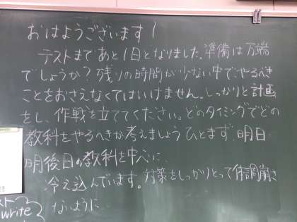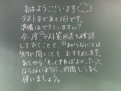 今朝の黒板日記です。明日からテストです。上の2枚は3年生教室、一番下の写真は2年生教室です。今回のテストは、1、2年生は5教科、3年生は9教科です。特に、3年生にとっては進路決定の大切な資料になるテストです。時間を大事にして取り組んでください。