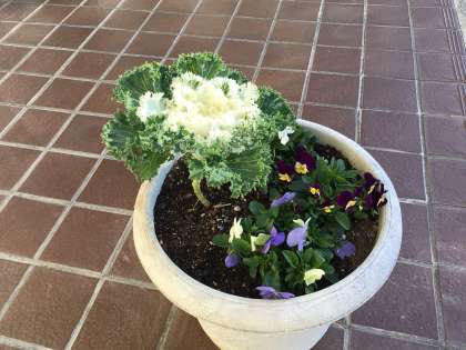 玄関のプランターに植えられているのはパンジーと葉牡丹(葉ボタン)です。お正月の寄せ植えにもよく使われる葉牡丹。この花を見ると年末が近いことを感じます。どことなく野菜にも見える葉牡丹。「食べられるの?」と以前聞いた子がいたのを微笑ましく思い出しました。