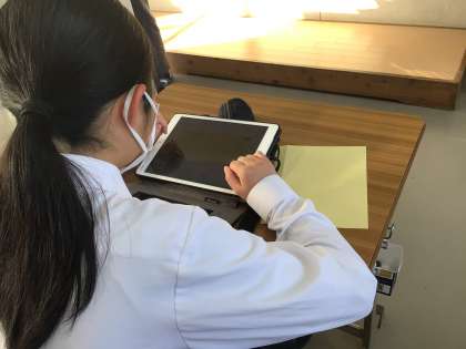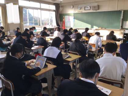 朝の時間を使って生徒会から依頼されたアンケートに答える生徒の様子です。各自のタブレットを使ってFormsのアンケートに答えます。