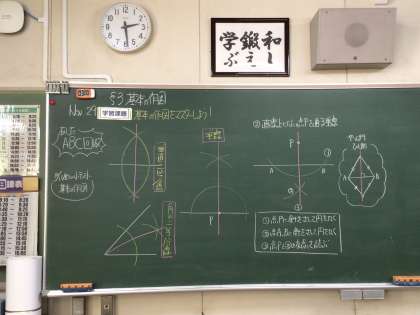 1年3組の数学の様子です。分度器、コンパスなどを使って作図を勉強していました。先生がヒントを出して考える生徒たち。「あ、そうか」「わかった!」と言いながらプリントの図形の中に線を書いたりコンパスで印をつけたりしていました。
