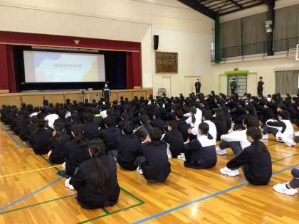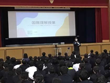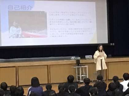 5時間目、体育館で1年生が国際理解授業を行っています。1年生は総合的な学習で「生き方」について学んでいます。今日はその授業の一環として豊田市まちづくり推進課で国際交流委員をしている方をお招きして、故郷であるフランスについて紹介してくれました。