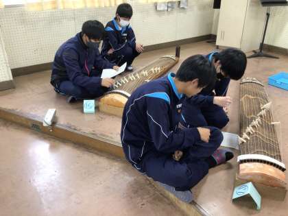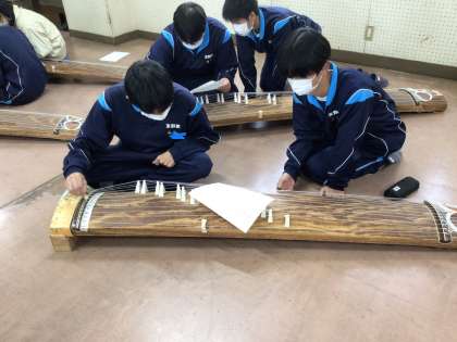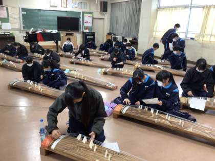 3年6組の様子です。3年生の生徒は筝に触れるのは中学生になってから2度目です。同じ「さくらさくら」の曲でも1年生よりちょっと難しい楽譜を使っていました。正座をする機会があまりないのでしょう、正座が苦手な生徒が多そうです。現代っ子ならではですね。