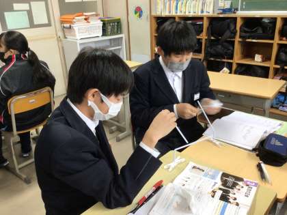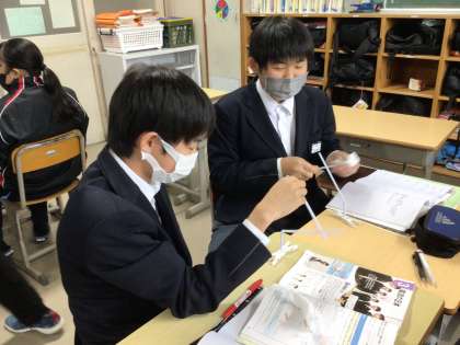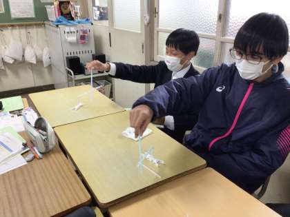 2年2組理科の様子です。静電気の働きでクルクル回るストロー。
