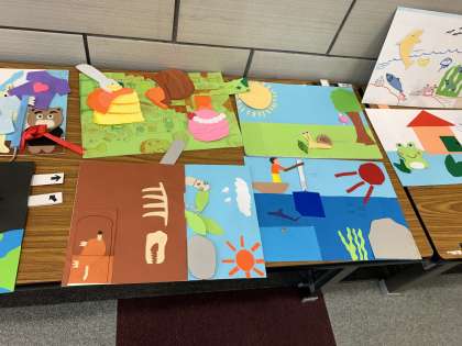 今週は3年1組の作品、来週は3年2組の作品と、1週間交代で3年生全クラスの作品を末野原交流館の遊び場に置いていただきます。小さい子たちが中学生の作品を見て触って喜んでくれると嬉しいですね。